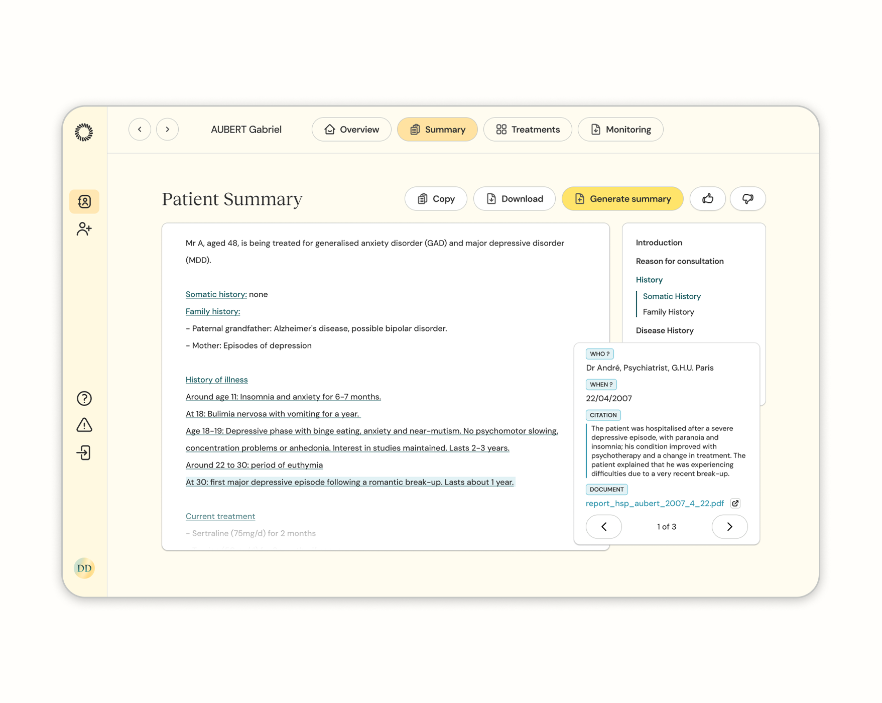 Callyope can analyse a wide range of psychiatric medical documents: consultation notes, hospitalisation reports, prescriptions, referral letters, and more. Our system handles unstructured clinical text in multiple formats (PDFs, Word documents, EHR exports) and extracts relevant clinical information automatically.